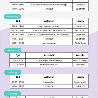 Voor alle jongeren in Rozenburg is er elke week van alles te doen. Van huiswerkondersteuning en creatieve activiteiten tot sport en chillmomenten. Onze activiteiten zijn gratis, laagdrempelig en bedoeld om elkaar te ontmoeten, plezier te maken en jezelf te ontwikkelen.